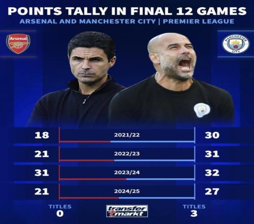 2024/25:阿森纳21分,曼城27分