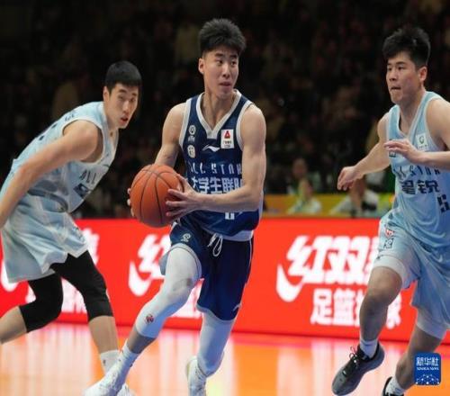 3月7日,大学生联队球员曹芷豪(中)在角逐中突破。新华社记者 孟永民 摄