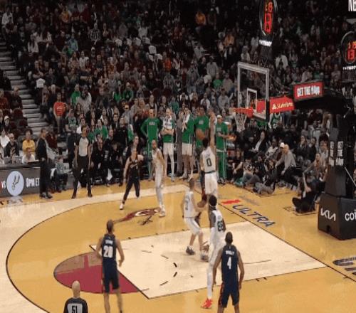 塔图姆同样使用空间 ,第一节背吃梅里尔 ,强攻泰森 ,骑士只能靠莫布里补位 ,但遮挡不住 。