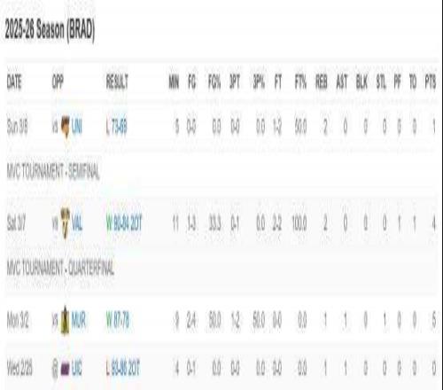 近两周,于泓凯依旧稳固获得进场时机,也很好地控制了犯规问题,四场角逐仅泛起1次犯规。在赛区锦标赛四分之一决赛中,他进场11分钟获得4分2篮板,资助球队加时击败敌手晋级赛区半决赛,惋惜球队不仇视手无缘晋级。后续若布拉德利未被约请加入其余季后赛事,于泓凯本赛季的角逐就所有竣事。