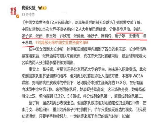 在已往的三场角逐,刘禹彤划分砍下了12分,17分和11分,三场角逐,一共获得了40分17篮板,是球队的得分王,比另一其中锋张子宇,得分多了足足11分,可以说,刘禹彤是中国女篮场上的一个稳固得分点 。可是,却被镌汰出局,真的让许多球迷有点想不明确 。