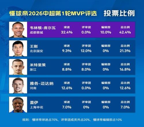 各人好 ,接待来到懂球帝2026赛季中超MVP的评选现场。在本赛季的第1轮MVP评选中 ,成都蓉城外助韦林顿-席尔瓦以42.4%的得票率乐成中选新赛季第一个MVP。