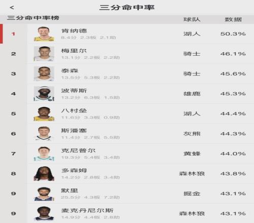 在全明星之前,伊森赛季三分掷中率48.8%,高居同盟第二,仅次于肯纳德(49.7%)。再看看现在三分掷中率排行榜:湖人的肯纳德提升至50.3%,继续领跑全同盟;骑士梅里尔46.1%同盟第二;骑士的杰隆-泰森45.6%排第三。