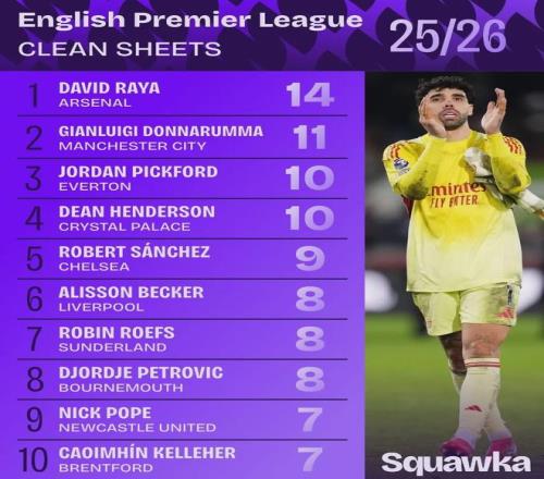 Squawka统计,拉亚本赛季已经在英超完成了14场零封,零封场次已经凌驾了上赛季(联赛)。