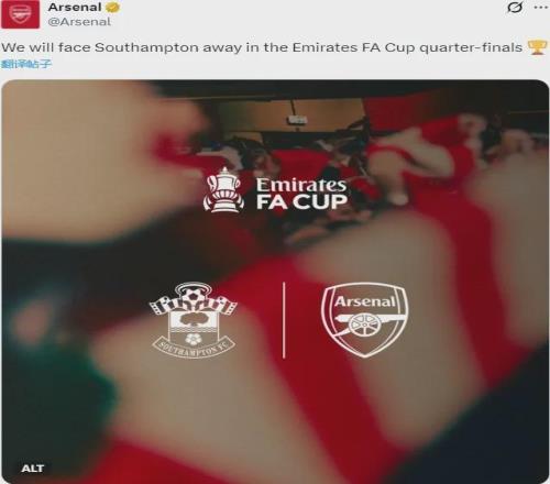 官方:阿森纳在足总杯四分之一决赛中抽到了南安普顿,枪手将客场作战。
