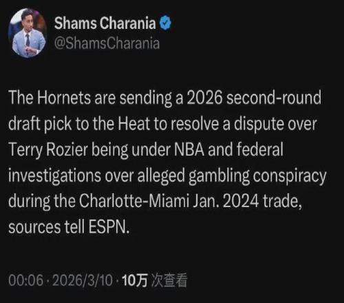 爆料王Shams:黄蜂送出一个26年次轮签赔偿给热火 ,以此解决24年生意泛起的纠纷。