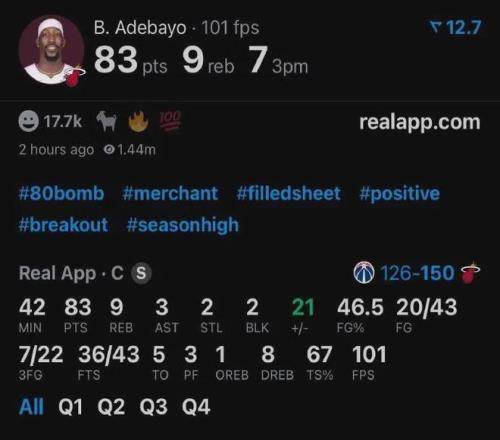 次节阿德巴约得分继续上双,半场竣事时已获得43分,突破詹姆斯坚持的热火队史半场纪录(37分)。