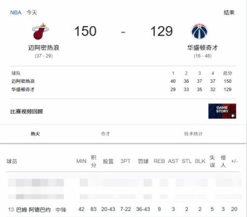 克日,在刚刚竣事的NBA通例赛热火VS奇才的角逐中,热火的球员阿德巴约在角逐中打出了统治级别体现,轰下了单场83分,这场角逐热火以150-129取告捷利。