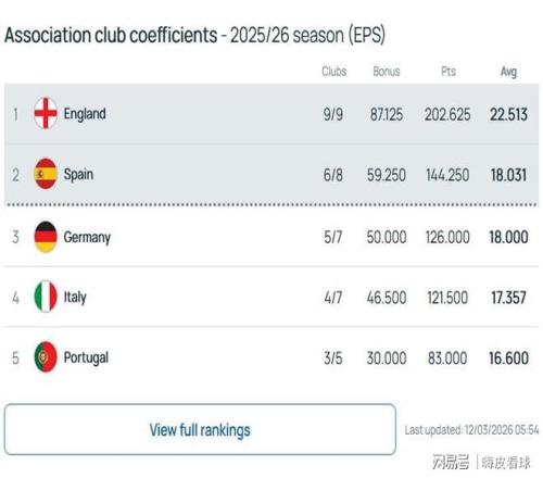 例如,阿森纳排在第一,获得12分的奖励,利物浦和热刺排在三四名,划分有11.5分和11.25分,切尔西、曼城和纽卡斯尔,划分有10.75分、10.25分和9.25分,6队合计有65分,再除以9队,单单盘算这个欧冠排名奖励,就为英超孝顺了7.22分,相当可观。