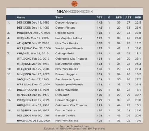 没有加时赛的情形下,首发五人合砍137分排名历史第一。即便算上加时赛,137分也能排历史第四。前三划分是:1、1983年掘金首发142分(3加时) ;2、1983年活塞首发142分(3加时) ;3、2006年太阳首发合计138分(1加时)。