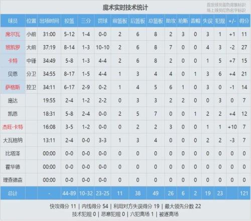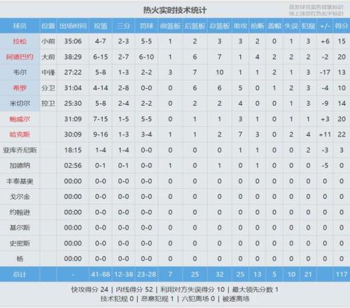 热火这边 ,鲍威尔本场复出被贬为替补 ,今天投篮15中7 ,三分5中1 ,罚球5中5 ,拿到20分3助攻 ,正负值+3。阿德巴约体现平平 ,投篮15中6 ,三分6中2 ,罚球10中6 ,获得20分7篮板1助攻4抢断2盖帽2失误2犯规 ,正负值-2。