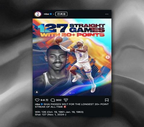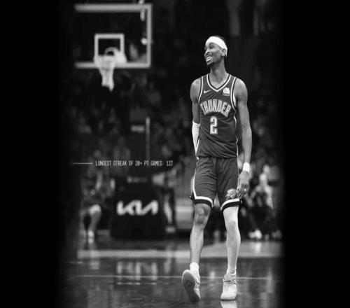 雷霆队球星 SGA 谢伊·吉尔杰斯-亚历山大一连 127 场角逐得分 20+ 的神勇体现,正式逾越篮球天子张伯伦在 1963 年 1 月创下的 126 场纪录,成为该项数据当之无愧的「历史第一人」。