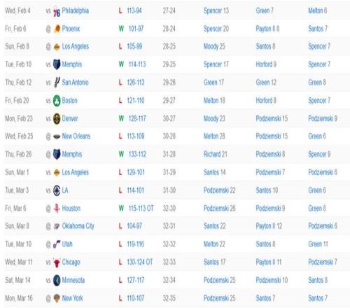 勇士队领先21分被逆转吞下五连败 ,终场前28秒波杰姆斯基拼下后场篮板 ,在终场前23秒错失了反超的三分球 ,终场前16秒桑托斯对沙梅特犯规 ,随后沙梅特两罚全中拉开到3分 ,终场前7秒波杰姆斯基抢了一个两分 ,但随后阿奴诺比两罚全中 ,终场前1秒桑托斯传球失误。