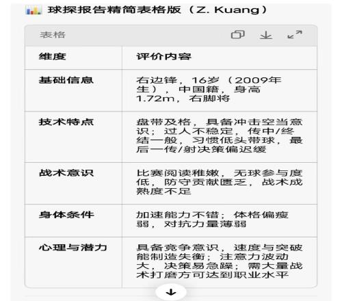 这个球探报告写了啥,翻译过来就是(下图)几点:划分有基础信息、手艺特点、战术意识、身体条件以及心理和潜力5大块内容,还挺周全的。邝兆雷的基础信息各人都清晰,这里就不赘述了。就单独说说其他4大块。