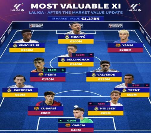 西甲最贵阵容十一人所有来自于皇马和巴萨 ,其中皇马七人 ,巴萨四人。锋线上是维尼修斯、姆巴佩和亚马尔 ,中场则是贝林厄姆、佩德里和巴尔韦德 ,后防地上是卡雷拉斯、库巴西、赫伊森和阿诺德 ,门将位置上则是霍安-加西亚 ,这套阵容的总身价为12.7亿欧元。