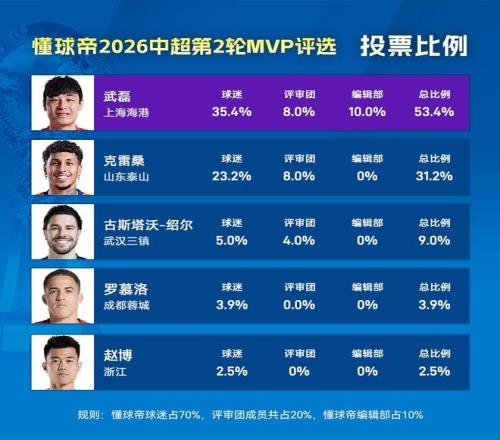 各人好,接待来到懂球帝2026赛季中超MVP的评选现场。在本赛季的第2轮MVP评选中,伤愈复出的“武球王”以53.4%的高得票率乐成中选本轮MVP,这也是武磊第22次中选懂球帝MVP。