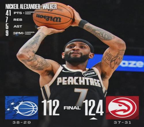 老鹰球员亚历山大-沃克出战37分钟 ,投篮21中12 ,三分14中9 ,罚球9中8 ,爆砍41分7篮板5助攻2抢断 ,正负值+27全场最高!单场41分和9记三分 ,均是沃克生涯新高。新鹰王杰伦-约翰逊19投10中 ,拿到24分15篮板13助攻。