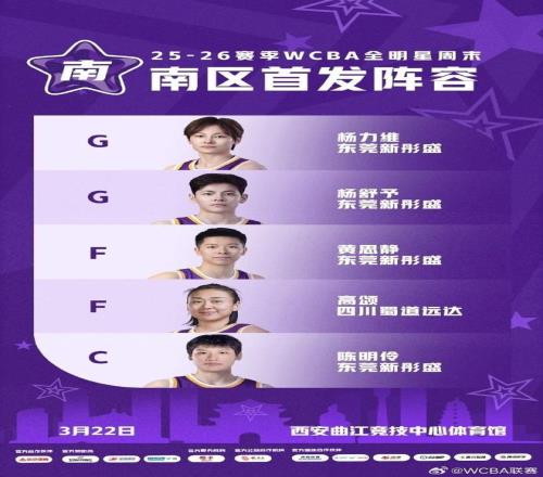 除此之外,南区首发有多达4人来自广东女篮,除了杨力维与杨舒予之外,尚有黄思静与陈明伶,其中陈明伶现在也是在征战世预赛,剩余一位首发是四川女篮的前国手高颂。