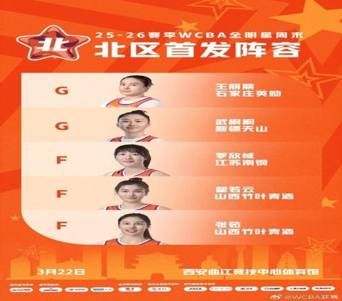 至于北区首发票王是靠近18万票的前女篮国手武桐桐,山西女篮翟若云与张茹携手入选首发,外加王丽丽与罗欣棫也是入选首发。