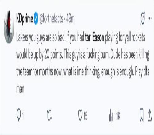杜兰特球迷:伊森完全是在为湖人打球 ,这家伙简直就是一个废物 ,他已经一连几个月拖累我们了 ,我以为该放弃他了 ,该换人上阵了 ,快点裁掉他吧。