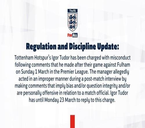 ÍÐÌØÄÉÄ·Èȴ̶ӵÄÒÁ¸ê¶û-ͼ¶à¶û£¬ÒòÔÚ3ÔÂ1ÈÕÓ¢³¬¶ÔÕó¸»ÀÕÄ·µÄÈüºó½ÒÏþÏà¹ØÑÔÂÛ£¬±»Ö¸¿Ø±£´æ²»µ±ÐÐΪ¡£ÕâλÖ÷˧ÔÚÈüºó²É·ÃÖÐÐÐΪʧµ±£¬ÆäÑÔÂÛÉæÏÓÌåÏÖ²ÃÅб£´æË½¼û¡¢ÖÊÒɲÃÅй«ÕýÐÔ£¬»ò¶ÔÈüʹÙÔ±¾ÙÐÐÈËÉí¹¥»÷¡£ÒÁ¸ê¶û-ͼ¶à¶ûÐèÔÚ3ÔÂ23ÈÕǰ¶Ô¸ÃÖ¸¿Ø×÷³ö»ØÓ¦¡££¨Í¨¸æÍ꣩