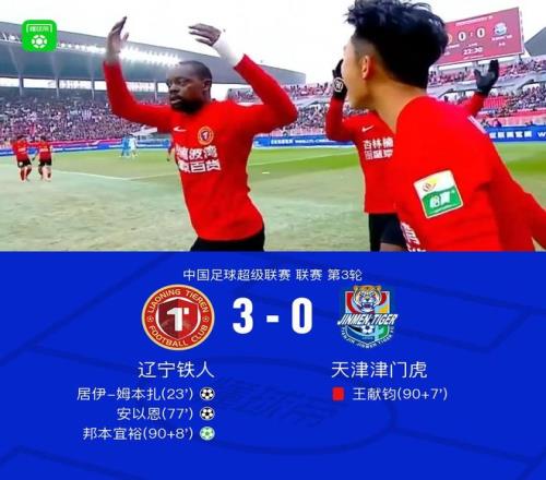 北京时间3月21日15:30 ,中超第3轮继续举行 ,辽宁铁人坐镇沈阳铁西体育场迎战天津津门虎 ,本场主裁判为戴弋戈 ,VAR裁判为黄翼。上半场 ,王秋明开场失良机 ,随后姆本扎攻入辽宁铁人中超首球。下半场 ,安以恩兜射再下一城;补时阶段 ,王献钧吃到红点套餐 ,邦本宜裕勺子点球破门。最终 ,铁人3-0完胜津门虎 ,迎中超首胜。