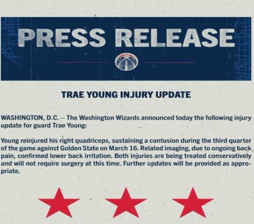 奇才官方:特雷杨右股四头肌挫伤+下背部刺激 ,将无限期缺战