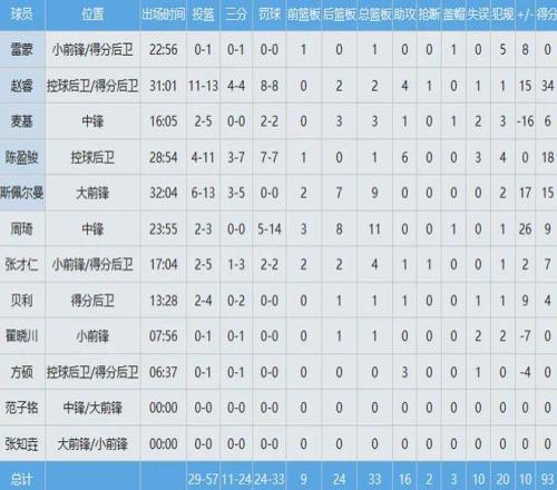 第三节单节5中5独揽14分,最终全场出战31分钟,投篮13中11,三分4中4,罚球8中8爆砍34特殊加2板4助1断,正负值+15,向导北京队93-83逆转辽宁队。