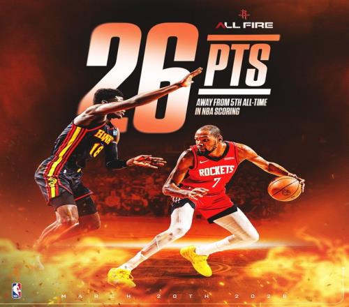 火箭官方:铭刻于历史之中的杜兰特 ,他刚刚在总得分上逾越乔丹成为NBA历史得分榜排名第五的球员。