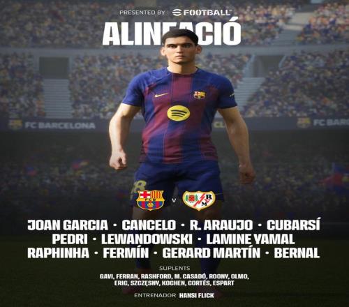 巴萨vs巴列卡诺:莱万、亚马尔首发,阿劳霍、佩德里出战