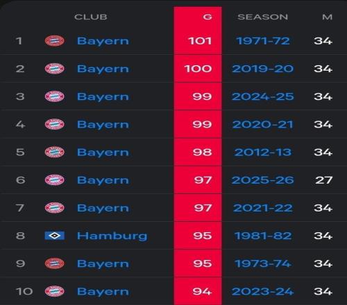 1.拜仁慕尼黑 101球 1971-72赛季 34轮角逐