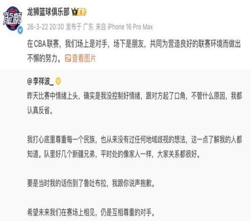 广州龙狮俱乐部转发鲁吐布拉和李祥波社媒并写道:“在CBA联赛 ,我们场上是敌手 ,场下是朋侪 ,配合为营造优异的联赛情形而做出不懈的起劲。”