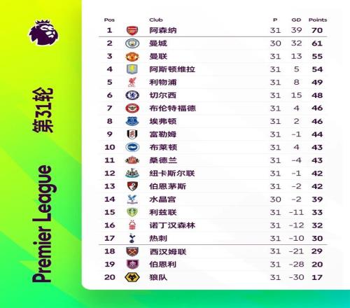 北京时间3月23日晚 ,本轮英超除曼城对阵水晶宫延期外 ,其他9场角逐所有竣事。由于本周阿森纳在联赛杯决赛对阵曼城 ,双方本轮联赛脱期举行(阿森纳角逐提前至2月19日 ,曼城角逐则推迟 ,详细时间待定)。在提前举行的那场对决之中 ,狼队爆冷2比2逼平领头羊阿森纳 ,现在枪手多赛一场情形下仍领先曼城9分;本周开打的8场英超31轮角逐中 ,曼联2比2被伯恩茅斯逼平仍位列第三;而阿斯顿维拉2比0轻取保级球队西汉姆联 ,离曼联仅剩1分;利物浦则是1比2负于布莱顿继续位居第五 ,切尔西0比3惨败埃弗顿 ,红蓝两军双双折戟。