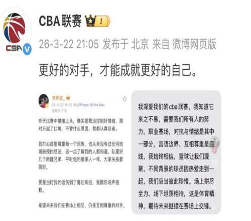 CBA官方转发了两个当事人的社媒回应并写道:“更好的敌手 ,才华成绩更好的自己。”