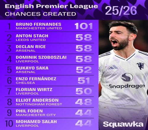 克日,着名数据机构Squawka宣布了本赛季阻止现在的英超创立时机榜。曼联中场布鲁诺-费尔南德斯以创立101次时机遥遥领先该榜单。