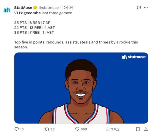三场角逐,他的助攻失误比是19:4,掷中率凌驾五成,三分凌驾四成 。若是他能把这种状态延续到季后赛,那76人这笔探花签就值了 。若是只是昙花一现,那他照旧谁人“无意闪光”的第三名 。