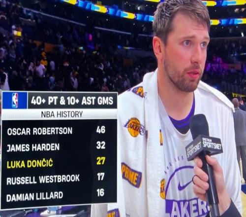 第八 ,东契奇生涯第27次砍至少40分10助攻 ,历史第三多并且仅次于大O和哈登。