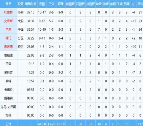 此役杜兰特31分8板8助3帽,申京24分6板7助2帽,阿门18分3板7助。