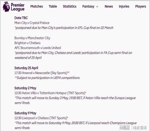 ´Ó¹Ù·½µÄʱ¼ä±íÀ´¿´£¬³ýÁËÂü³ÇÃæÁÙË®¾§¹¬µÄ½ÇÖðÖ®Í⣬ÓÉÓÚ×ã×ܱ­°ë¾öÈüºÍÓ¢³¬µÚ34ÂÖÖØºÏ£¬Âü³Ç¿Í³¡ÌôÕ½²®¶÷Àû£¬ÇжûÎ÷¿Í³¡ÌôÕ½²¼À³¶Ù£¬ÒÔ¼°Àû×ÈÁª¿Í³¡ÌôÕ½²®¶÷é˹£¬ÕâÈý³¡½ÇÖðÒ²±»±êÉÏTBCµÄ·ûºÅ£¬Òâζ×ÅÒѾ­È·¶¨ÍÑÆÚ£¬Ö»ÊÇÏêϸµÄʱ¼ä£¬»¹ÐèÒªÆÚ´ýЭµ÷Âäʵ¡£
