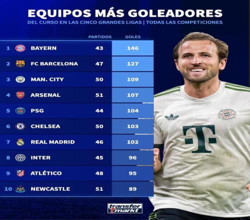 北京时间4月7日,德转列出了本赛季至今欧洲五大联赛球队各项赛事进球榜,拜仁慕尼黑以43场打进146球高居第一,巴塞罗那47场127球第二,曼城50场109球第三。